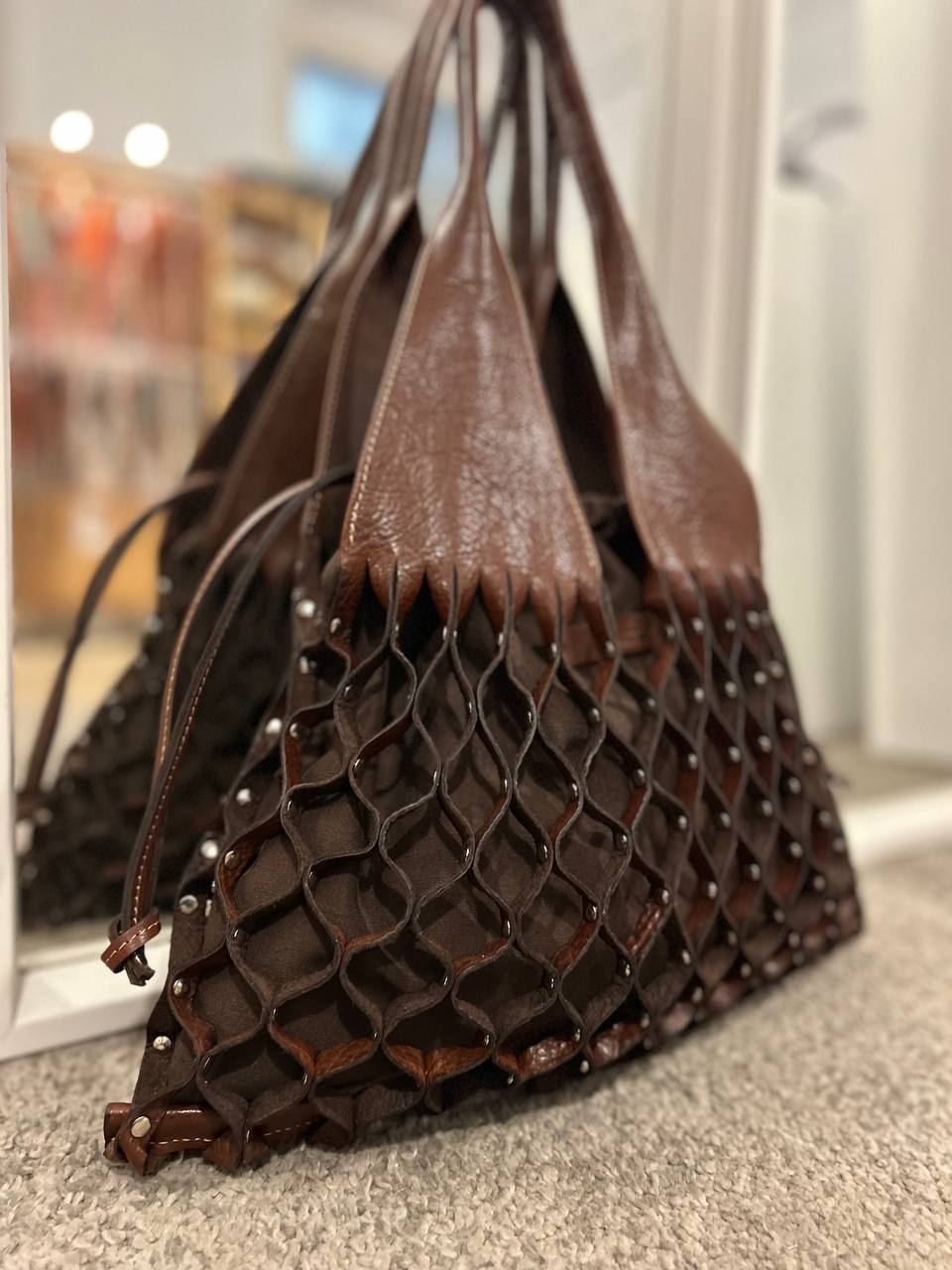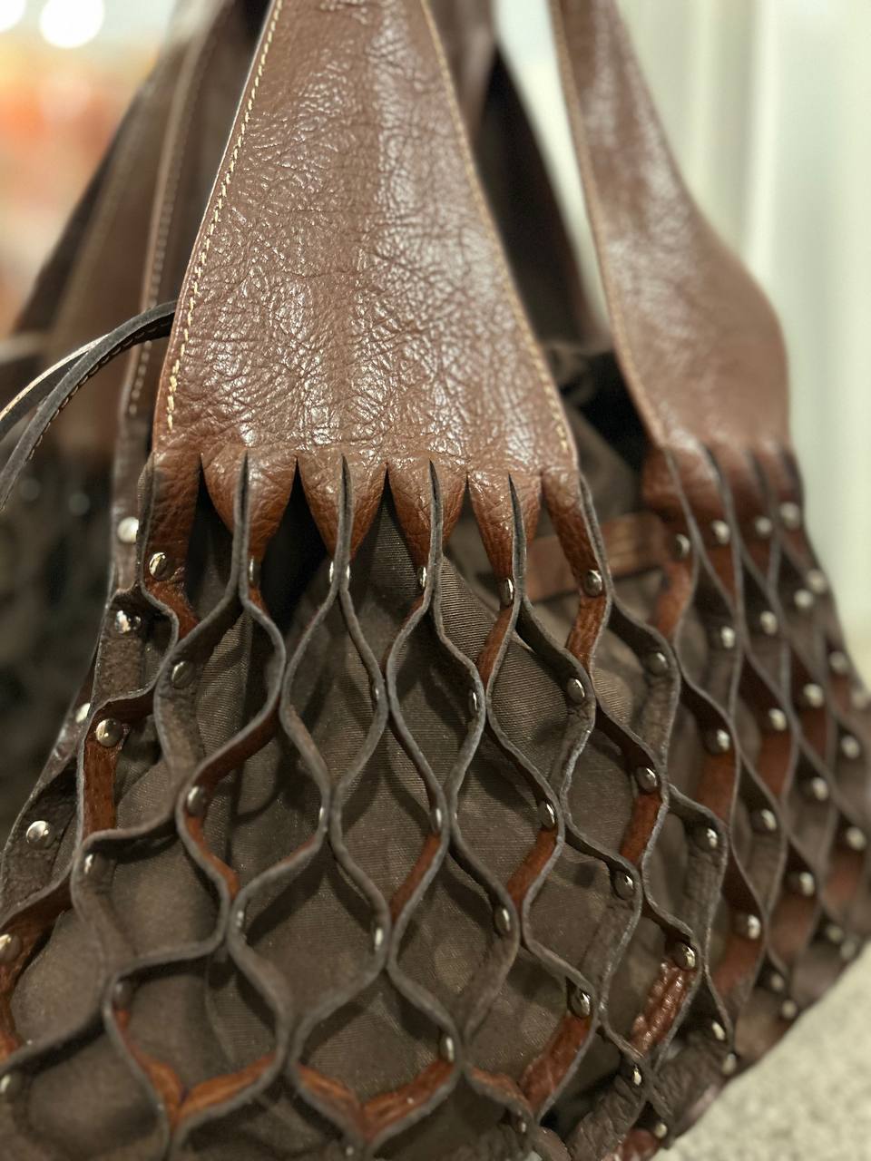 Shoulder bag with mesh body in high quality leather straps and inner bag made of fabric.