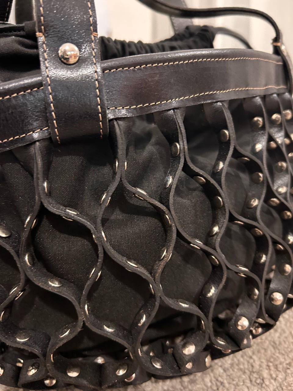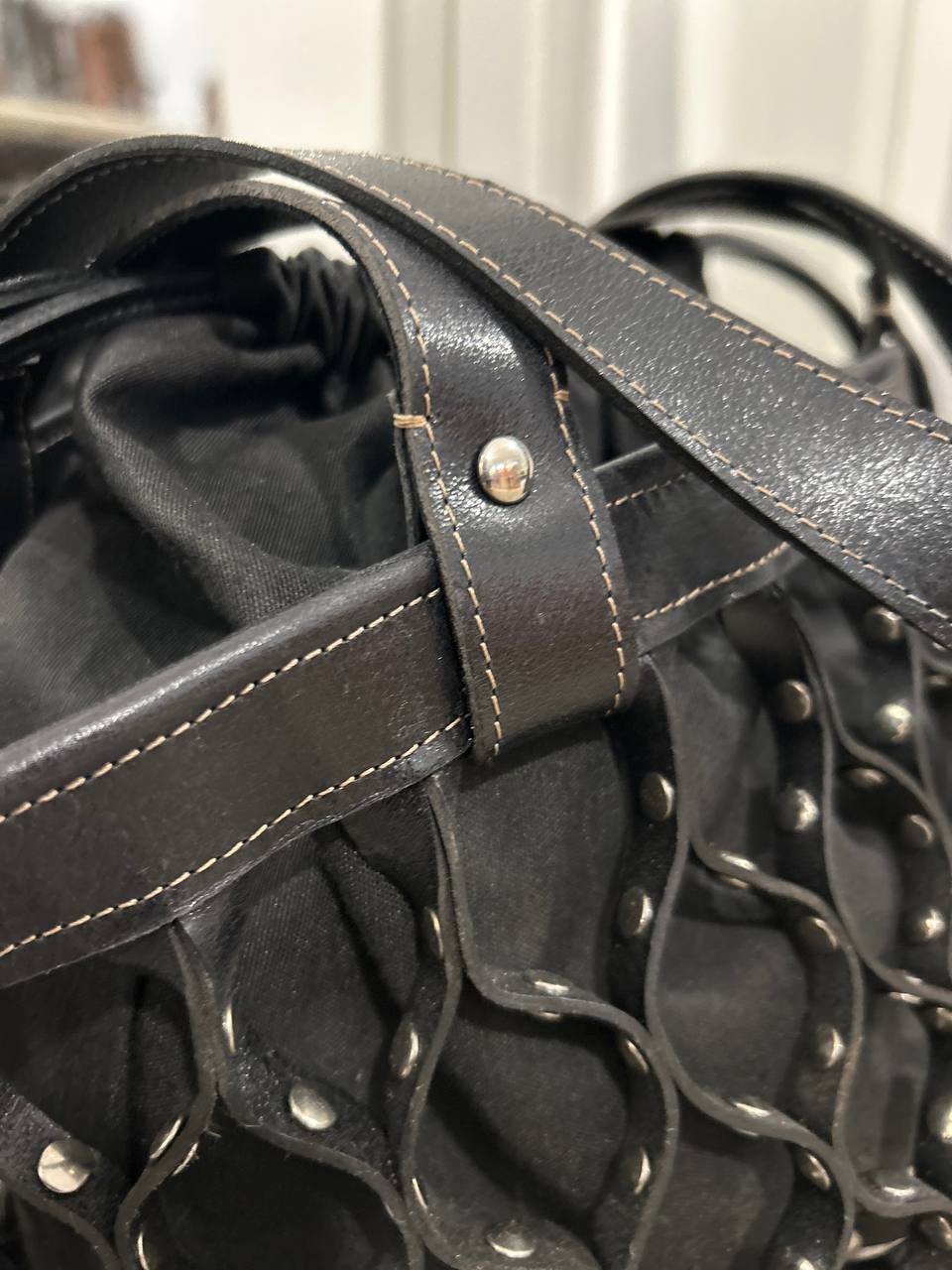 Bolso grande tipo cesta con cuerpo de malla en tiras de piel de alta calidad y bolsa interior de algodón. La bolsa cierra con un cordon de la misma piel.